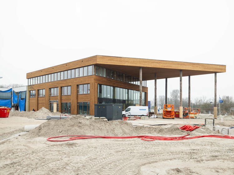 Een deel van de gevel bekleden we met lichtdoorlatende panelen van gerecycled kunststof. Deze panelen zijn licht van gewicht, isoleren goed en zorgen voor een natuurlijke lichtinval. De gevels van de werkplaatsen hebben een jas van hergebruikte sandwichpanelen van oude koelcellen. Zo besparen we grondstoffen én de energie die normaal nodig is voor het maken van nieuwe panelen. Op het dakterras komen bamboeplanken. De tegelpaden voor onderhoud aan installaties maken we van hergebruikte betontegels.