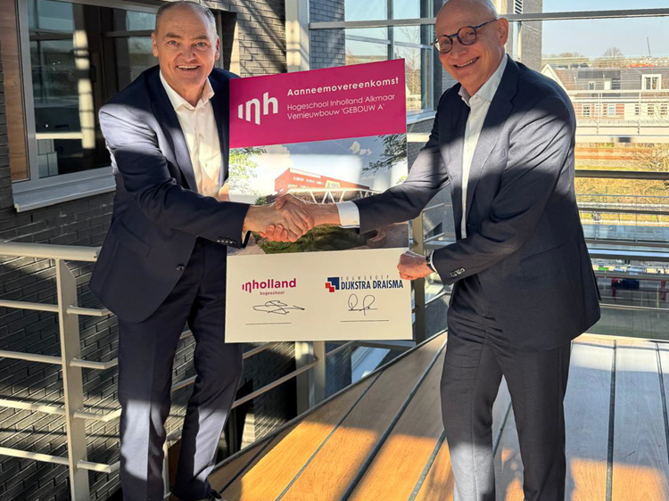 Biense Dijkstra en Jeroen van den Berg ondertekenden namens BGDD en Inholland de overeenkomst op de campus in Haarlem.  Na een aanbestedingsprocedure zijn wij geselecteerd voor de realisatie van twee nieuwe vleugels en de verbouwing van het bestaande gebouw. Een mooi project, waarbij we tijdens de (ver)bouwperiode alles in het werk stellen om de overlast voor studenten en medewerkers tot een minimum te beperken